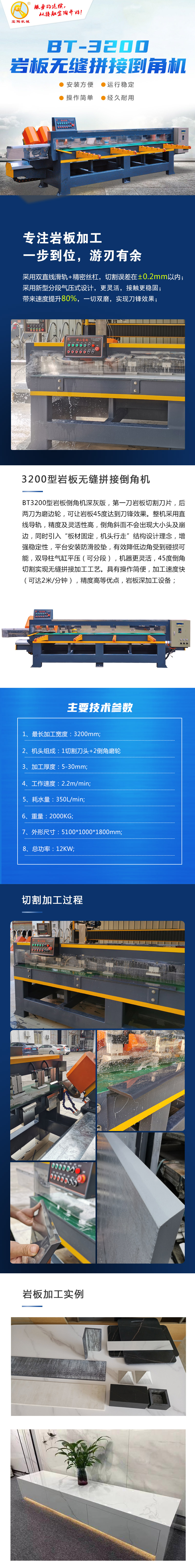 BT3200型巖板45度倒角機(jī),第一刀巖板切割刀片,后兩刀為磨邊輪,可讓巖板45度達(dá)到刀鋒效果。整機(jī)采用直線導(dǎo)軌,精度及靈活性高,倒角斜面不會(huì)出現(xiàn)大小頭及崩邊,同時(shí)引入“板材固定,機(jī)頭行走”結(jié)構(gòu)設(shè)計(jì)理念,增強(qiáng)穩(wěn)定性,平臺(tái)安裝防滑膠墊,有效降低邊角受到碰損可能,雙導(dǎo)柱氣缸平壓(可分段),機(jī)器更靈活,45度倒角切割實(shí)現(xiàn)無(wú)縫拼接加工工藝。具有操作簡(jiǎn)便,加工速度快(可達(dá)2米/分鐘),精度高等優(yōu)點(diǎn),巖板深加工設(shè)備;